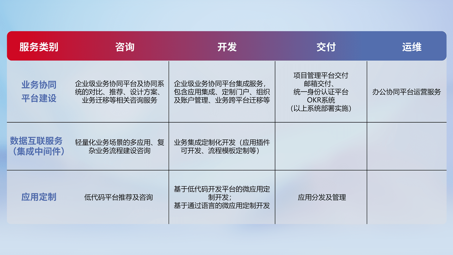 针对钉钉、、、、企微、、、IDaas等平台级产品提供产品的规划、、、、方案、、交付、、定制化开发等服务,,实现如统一协同办公、、、智能客户服务、、、混合会议管理、、、、智能数据查询、、、、等业务场景,,实现数字化转型。。