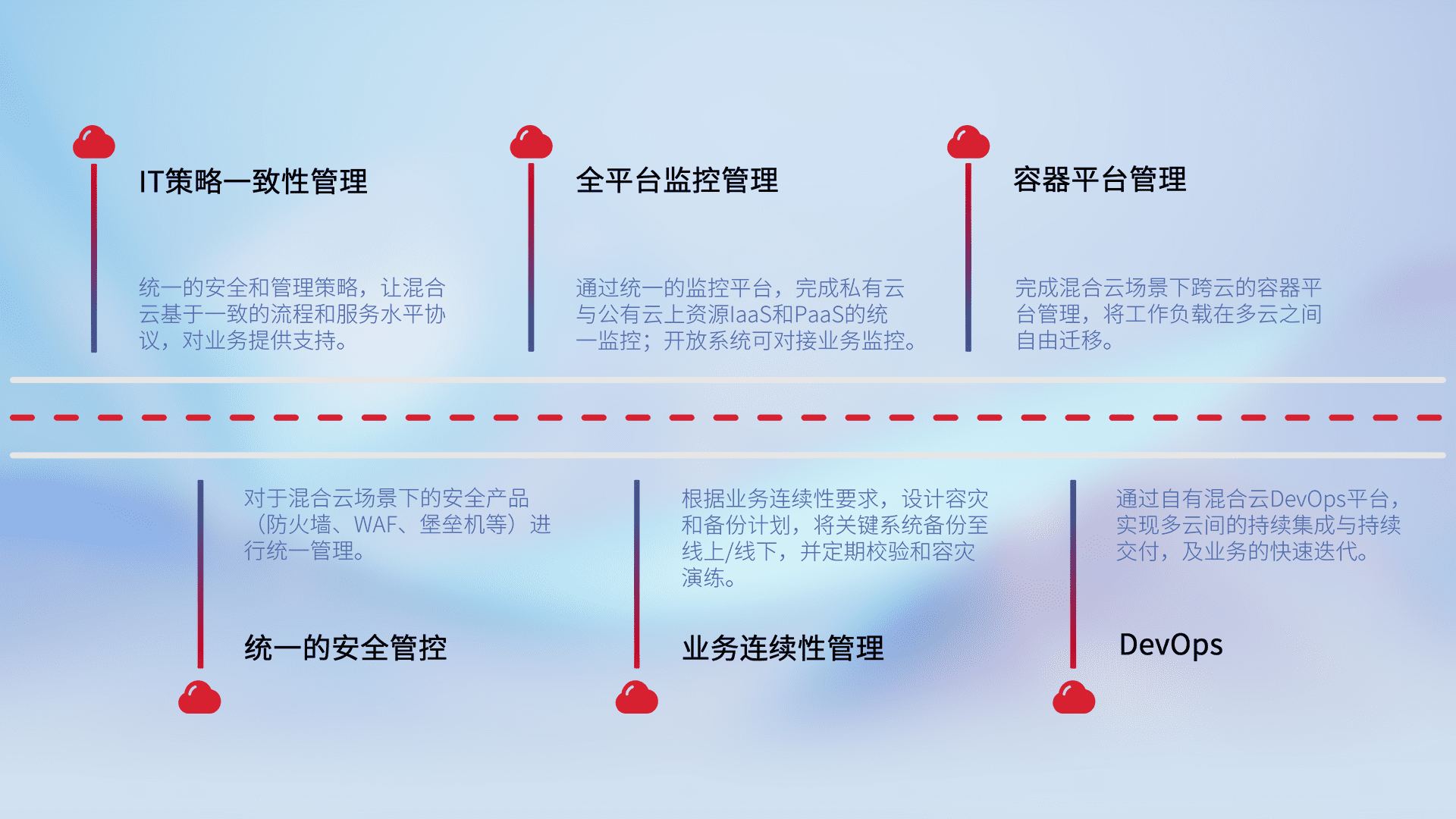 通过多云纳管,,,,以统一的资源数据模型把客户的云资源进行抽象和封装,,进而实现对多云资源的统一操作,,,,保障云资源管理的可靠性、、、稳定性与可用性。。。。量身定制化运维内容,,配置、、、开发运维、、、补丁管理、、备份、、、、监控、、、、认证和访问管理、、、、审计和日常巡检等,,,保障在用云过程中的可靠度,,稳定度以及高可用率。。