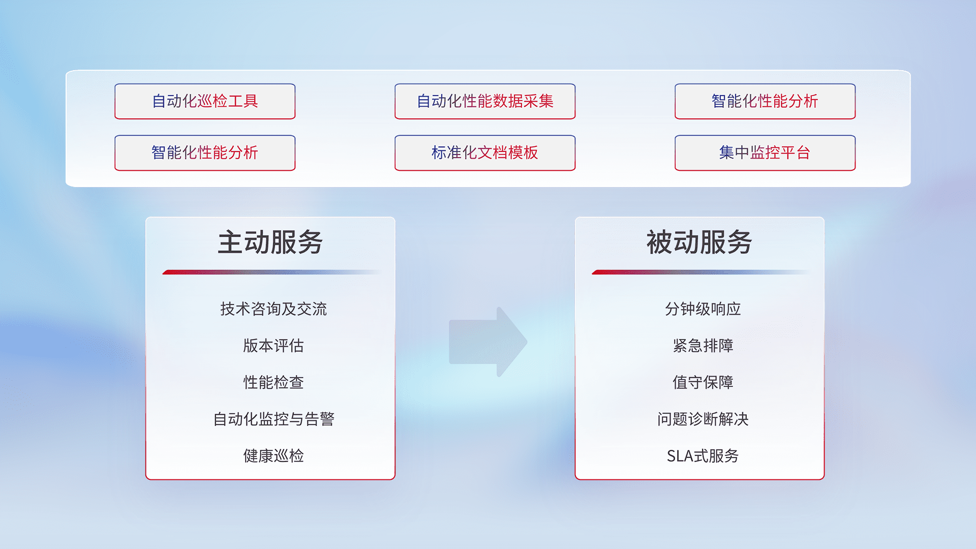 智能化工具和标准化文档,,,保障服务质量,,,,提供主动服务(包含技术咨询、、版本评估、、性能检查、、自动化监控与告警、、、健康巡检)和被动服务包含(分钟级响应、、紧急排障、、值守保障、、问题诊断解决、、、、SLA服务)。。。。