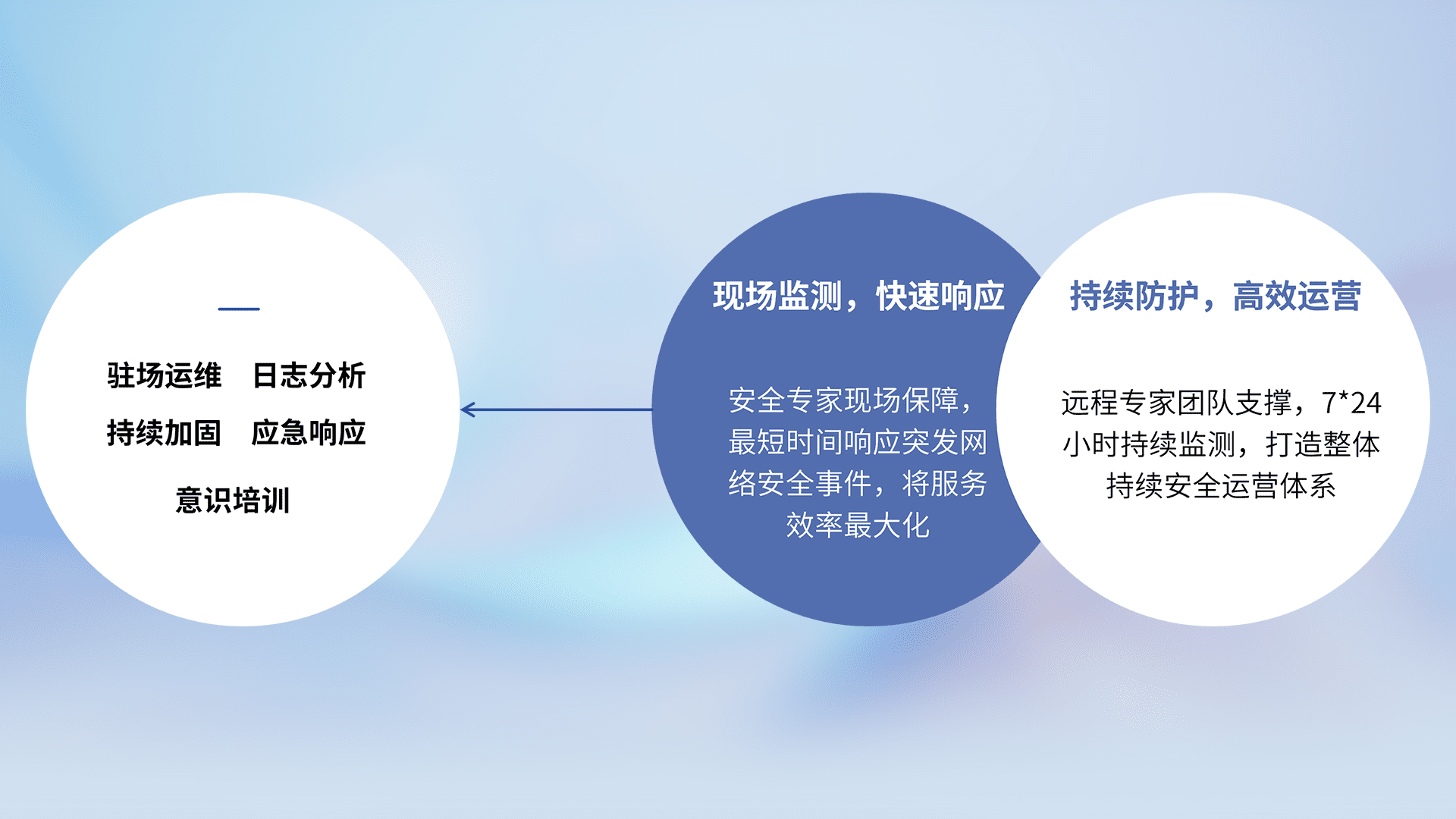 针对客户行业特性,,提供专属的一站式安全管理服务,,,帮助客户全面感知网络空间威胁,,通过安全专家的线上、、、、线下防护支持,,实现风险闭环,,,,将安全保障常态化,,为客户打造常态化安全运维运营服务。。